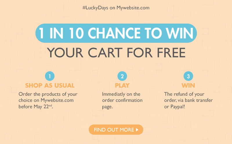 These steps must be present all along the buying process (sliders, banners, pages backgrounds etc.). Finally, the fun and immediate aspects of the offer (game and result displayed immediately after purchase) and the timing must be indicated on all promotional messages. Check out the following examples to get inspired.
