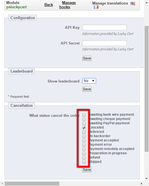 In the “cancellation” section of the module’s configuration interface, select the carts’ statuses you consider cancelled
