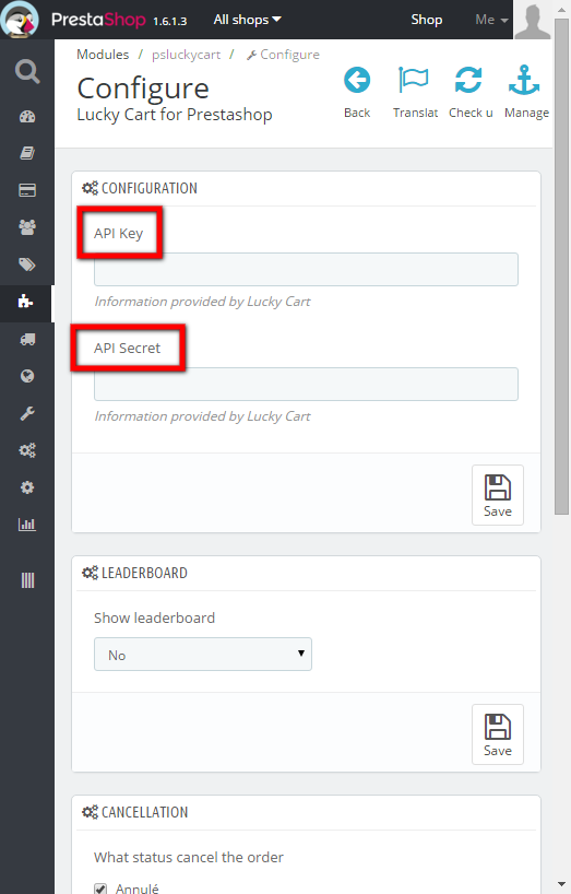 Then, in the “Configure” menu, input the API key/API secret of the required environment (pre-production or production) given by Lucky Cart: