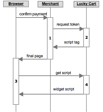 Le diagramme ci-dessous résume les communications établies entre le navigateur du client (l’acheteur), le site du marchand et les serveurs Lucky Cart pour la remontée des paniers et l'affichage du jeu sur la page de confirmation de commande :