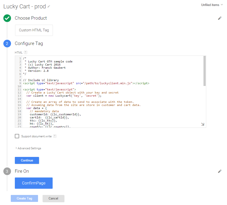 Dans le cadre de l'utilisation de la technologie Google Tag Manager pour intégrer Lucky Cart, les étapes détaillées ci-dessous pré-supposent de la part du marchand une connaissance approfondie du gestionnaire de tag.